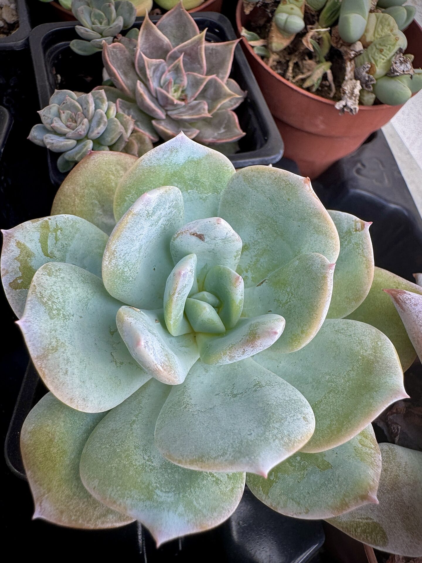 La Echeveria Gila es una suculenta de gran porte con hojas anchas y carnosas de tono verde empolvado, que adquieren un sutil tinte rosado en los bordes bajo el sol. Su roseta abierta y simétrica la convierte en una planta muy llamativa, ideal para centros de mesa, macetas decorativas o colecciones suculenteras. Es resistente, fácil de cuidar y luce espectacular en cualquier rincón soleado.