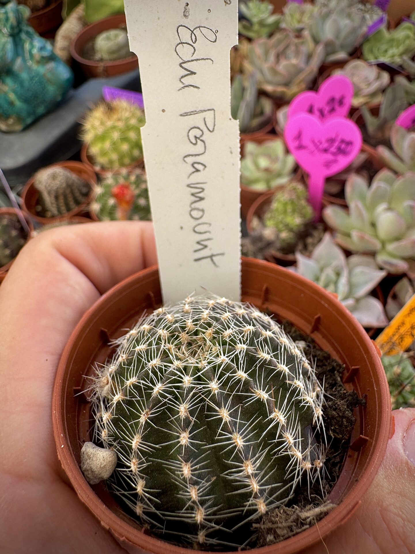 La Echinopsis ‘Paramount’ es un híbrido espectacular y muy buscado por los amantes de los cactus florales. Esta variedad destaca por sus impresionantes flores de gran tamaño, que pueden variar entre tonos rosas, naranjas o rojizos intensos, según el ejemplar y las condiciones de cultivo. Su cuerpo globoso, de color verde claro a oscuro, está cubierto por espinas cortas y bien dispuestas, lo que permite que la atención se centre por completo en su floración.